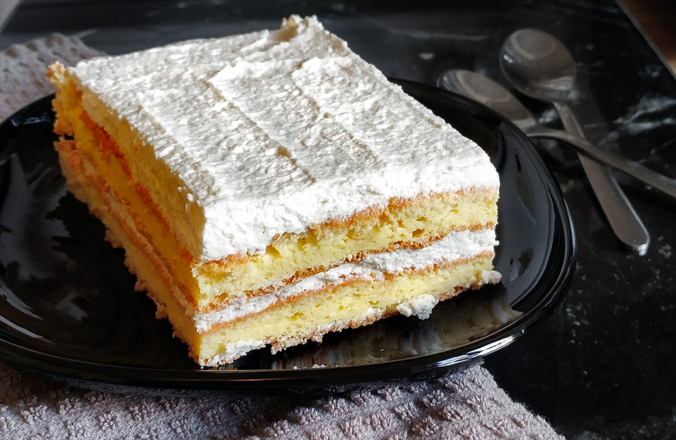 • Top with the first sheet of cooled Cake. Spread an even, generous, layer of Whipped Cream on top.